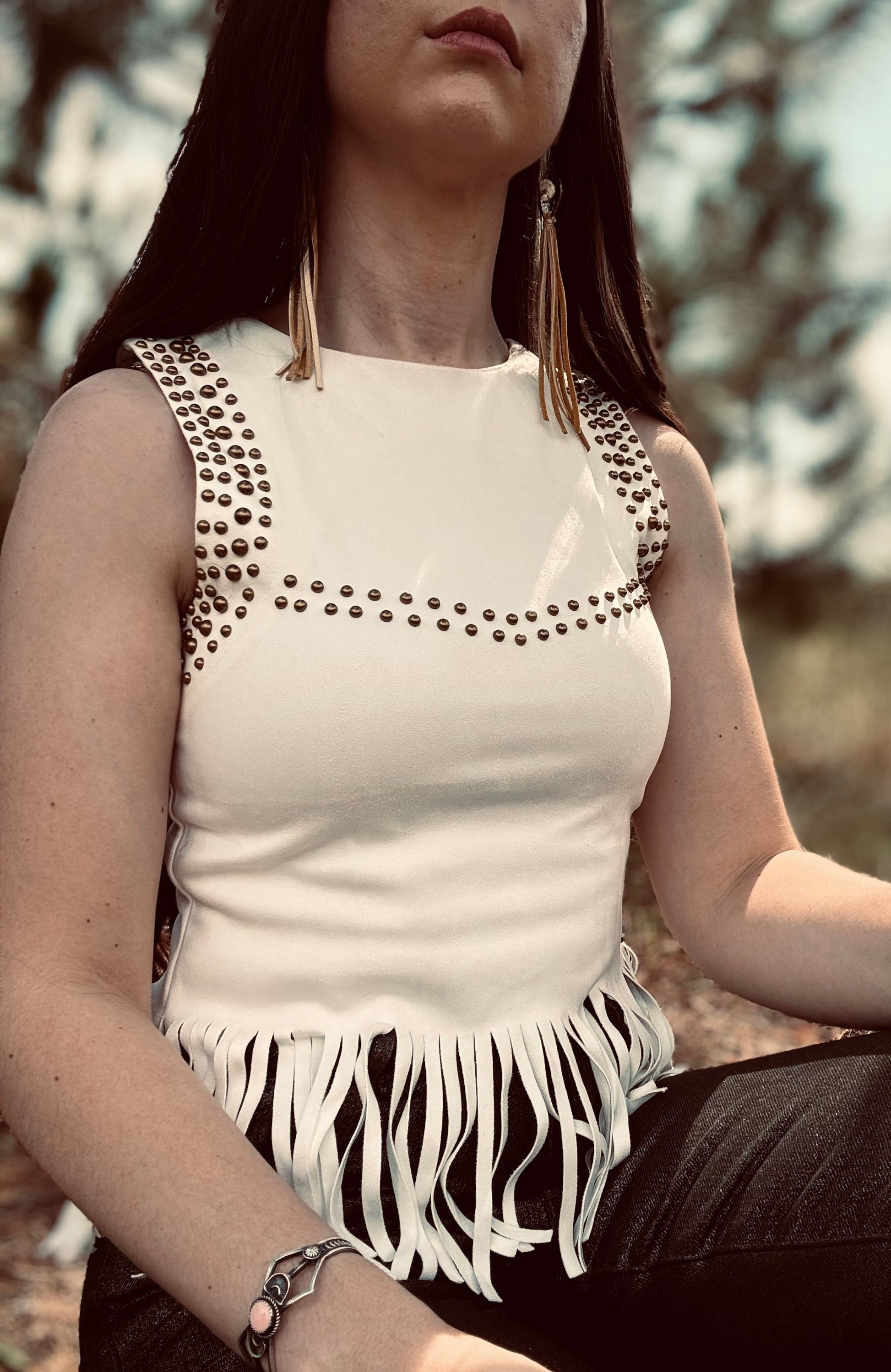 Studded ivory top with fringe hem