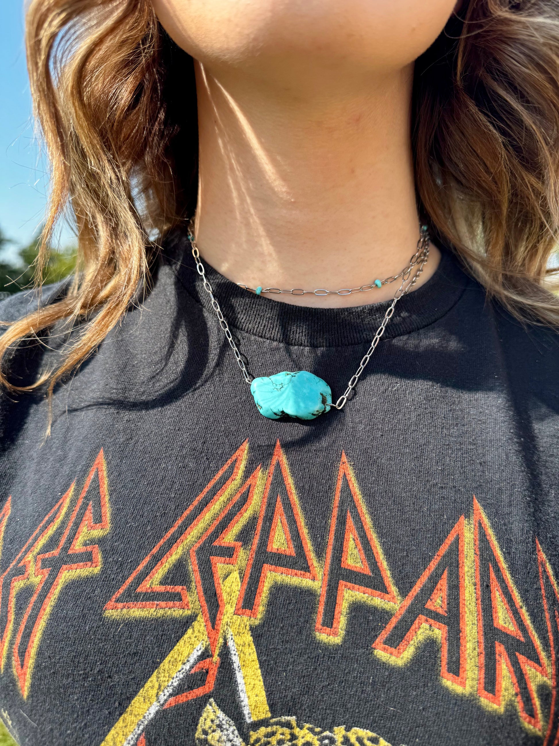 Handmade in the USA by The Bijoux FAB, this necklace features a minimalist silver-plated paperclip chain with a beautiful magnesite turquoise centerpiece. Each stone is natural and unique in color, matrix, and shape, so no two necklaces are exactly alike. Lightweight and versatile, this piece measures 14 inches plus an extender, making it perfect as a simple statement or a layering essential.