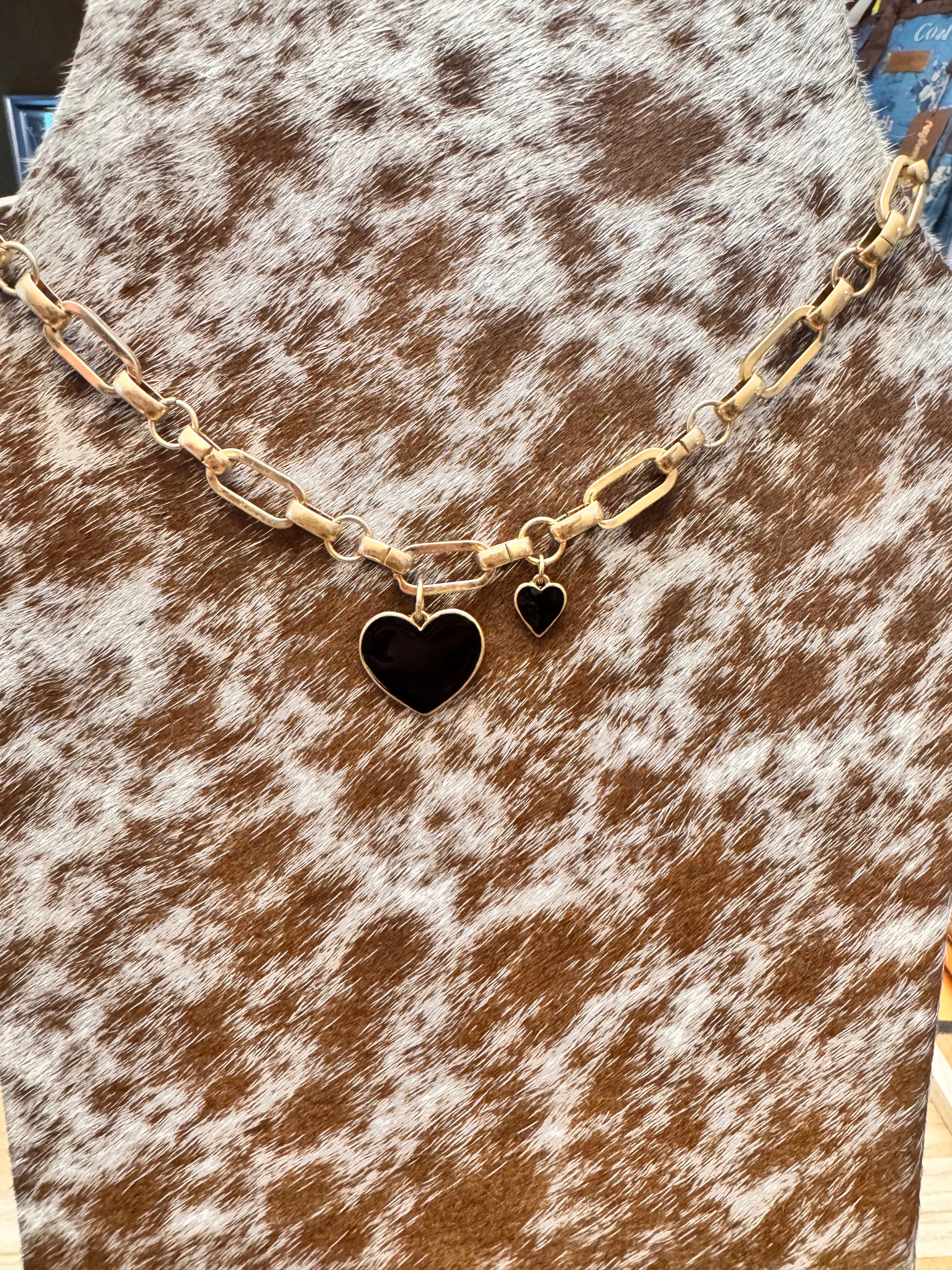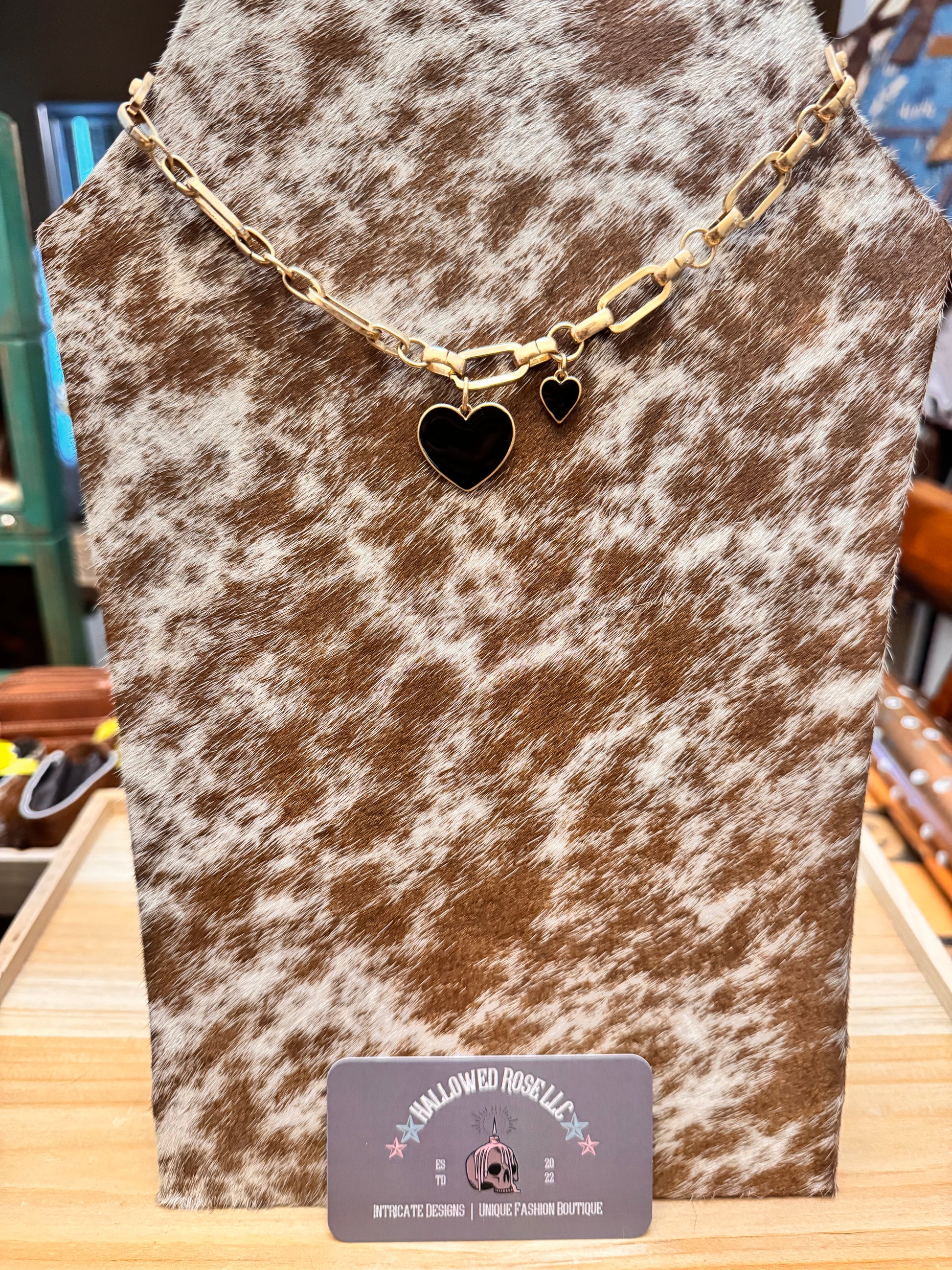 Double the Love Pendant Heart Necklace is a trendy new charm Necklace featuring two enamel white or black heart charms. This necklace has a thick gold plated chain that clasps for adjustable length.