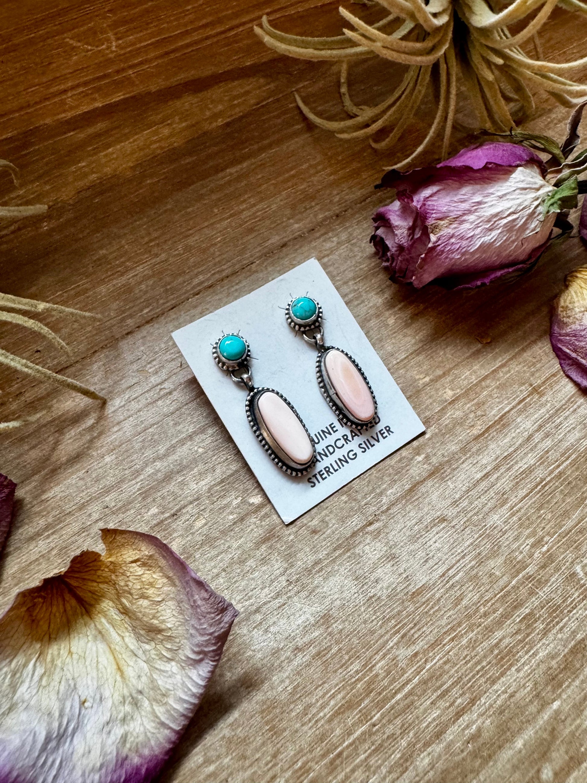 Kingman Turquoise & Pink Conch Dangle Earrings – Sterling Silver – Native Made by Marcella James
